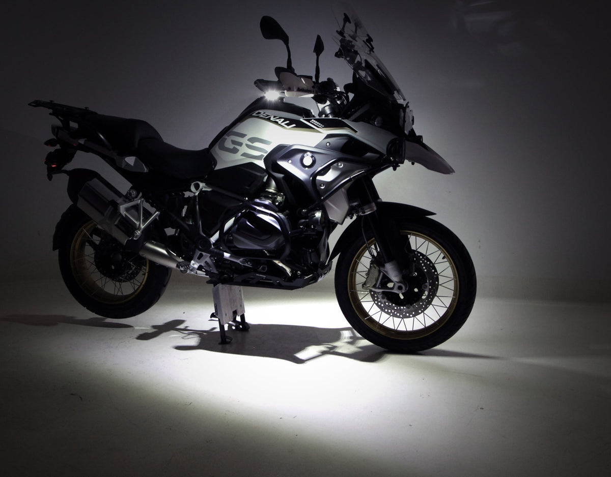 DENALI T3 Ultra-Viz 4-in-1 Motorcycle Safety & Visibility Lighting Kit positions switchback pods for 360° visibility with four functions, white DRL, amber turn, rock light, and puddle light. It enhances safety, trail visibility and nighttime parking illumination.