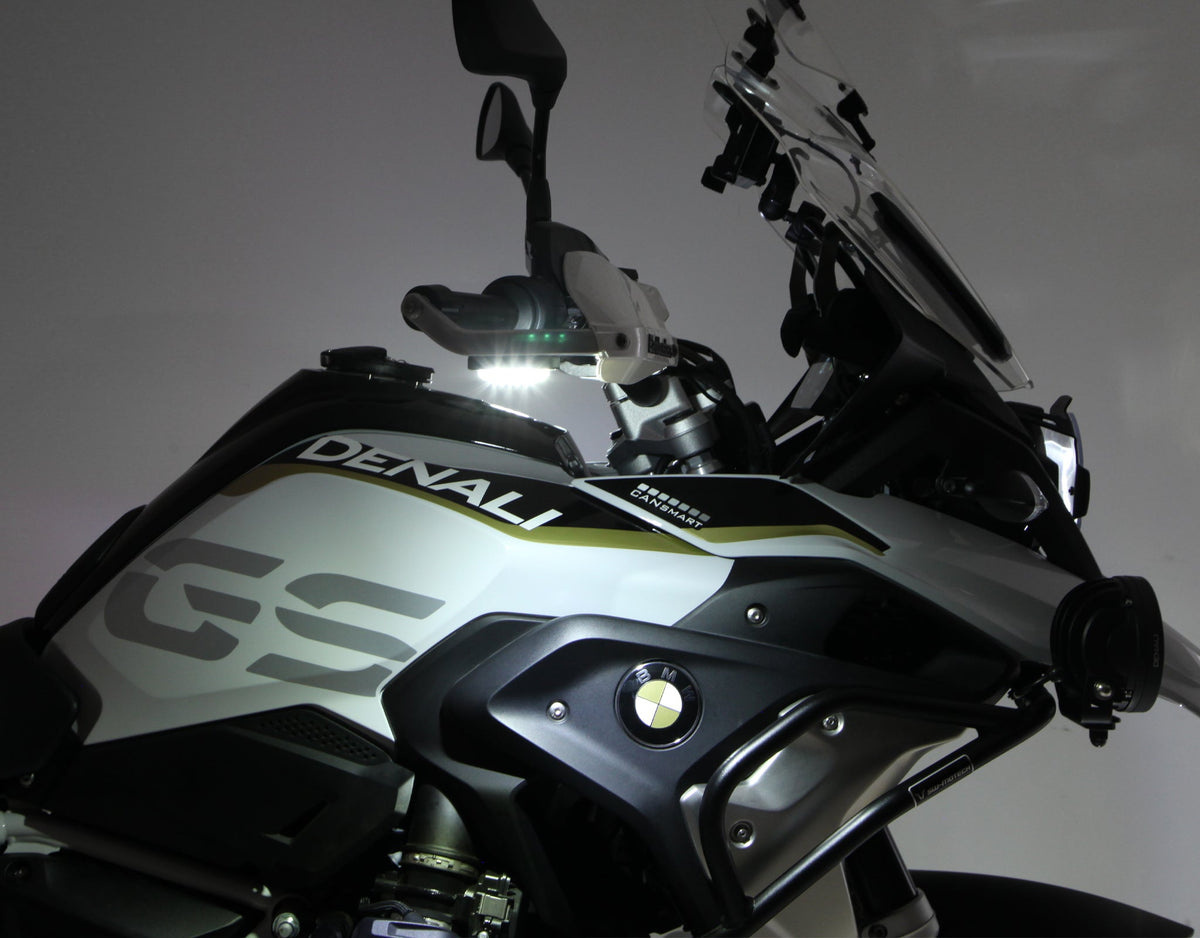 Lekit d'éclairage de sécurité et de visibilité pour moto DENALI T3 Ultra-Viz 4-en-1 positionne les pods switchback pour une visibilité à 360° avec quatre fonctions, DRL blanc, clignotant ambre, lumière de roche et lumière de flaque d'eau. Il améliore la sécurité, la visibilité sur les pistes et l'éclairage de stationnement nocturne.
